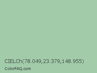 CIELCh 78.049,23.379,148.955 Color is a light green color and the nearest color is Cambridge Blue #a3c1ad. Hex code #a2cbaa and RGB value is rgb(162,203,170). In RGB color space, this color is composed of 64% red, 80% green, 67% blue, In CMYK color space, this color is composed of 20% cyan, 0% magenta, 16% yellow , 20% black , In HSL color space, this color has a hue angle of 132° , 28% saturation and 72% lightness.