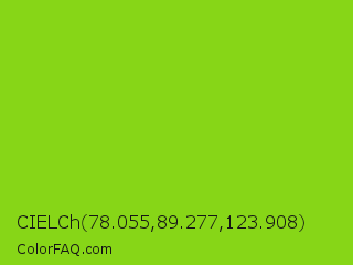 CIELCh 78.055,89.277,123.908 Color is a normal green color and the nearest color is Alien Armpit #84de02. Hex code #87d617 and RGB value is rgb(135,214,23). In RGB color space, this color is composed of 53% red, 84% green, 9% blue, In CMYK color space, this color is composed of 37% cyan, 0% magenta, 89% yellow , 16% black , In HSL color space, this color has a hue angle of 85° , 81% saturation and 46% lightness.