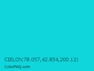 CIELCh 78.057,42.854,200.12 Color is a normal cyan color and the nearest color is Bright Turquoise #08e8de. Hex code #0fd6db and RGB value is rgb(15,214,219). In RGB color space, this color is composed of 6% red, 84% green, 86% blue, In CMYK color space, this color is composed of 93% cyan, 2% magenta, 0% yellow , 14% black , In HSL color space, this color has a hue angle of 181° , 87% saturation and 46% lightness.