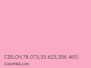 CIELCh 78.073,33.623,356.465 Color is a very light rose color and the nearest color is Nadeshiko Pink #f6adc6. Hex code #fbaac6 and RGB value is rgb(251,170,198). In RGB color space, this color is composed of 98% red, 67% green, 78% blue, In CMYK color space, this color is composed of 0% cyan, 32% magenta, 21% yellow , 2% black , In HSL color space, this color has a hue angle of 339° , 91% saturation and 83% lightness.