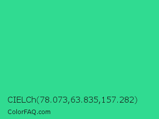 CIELCh 78.073,63.835,157.282 Color is a normal green color and the nearest color is Shamrock #33cc99. Hex code #30db91 and RGB value is rgb(48,219,145). In RGB color space, this color is composed of 19% red, 86% green, 57% blue, In CMYK color space, this color is composed of 78% cyan, 0% magenta, 34% yellow , 14% black , In HSL color space, this color has a hue angle of 154° , 70% saturation and 52% lightness.