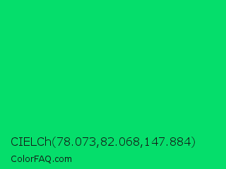 CIELCh 78.073,82.068,147.884 Color is a normal green color and the nearest color is Malachite #0bda51. Hex code #05de6b and RGB value is rgb(5,222,107). In RGB color space, this color is composed of 2% red, 87% green, 42% blue, In CMYK color space, this color is composed of 98% cyan, 0% magenta, 52% yellow , 13% black , In HSL color space, this color has a hue angle of 148° , 96% saturation and 45% lightness.