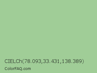 CIELCh 78.093,33.431,138.389 Color is a light green color and the nearest color is Eton Blue #96c8a2. Hex code #a0cd97 and RGB value is rgb(160,205,151). In RGB color space, this color is composed of 63% red, 80% green, 59% blue, In CMYK color space, this color is composed of 22% cyan, 0% magenta, 26% yellow , 20% black , In HSL color space, this color has a hue angle of 110° , 35% saturation and 70% lightness.