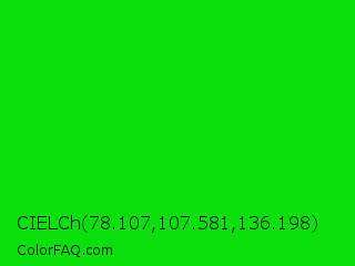 CIELCh 78.107,107.581,136.198 Color is a normal green color and the nearest color is Green #00ff00. Hex code #09e00b and RGB value is rgb(9,224,11). In RGB color space, this color is composed of 4% red, 88% green, 4% blue, In CMYK color space, this color is composed of 96% cyan, 0% magenta, 95% yellow , 12% black , In HSL color space, this color has a hue angle of 121° , 92% saturation and 46% lightness.