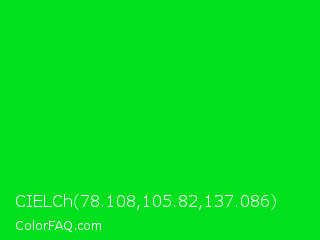 CIELCh 78.108,105.82,137.086 Color is a normal green color and the nearest color is Vivid Malachite #00cc33. Hex code #00e01c and RGB value is rgb(0,224,28). In RGB color space, this color is composed of 0% red, 88% green, 11% blue, In CMYK color space, this color is composed of 100% cyan, 0% magenta, 88% yellow , 12% black , In HSL color space, this color has a hue angle of 128° , 100% saturation and 44% lightness.
