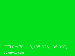 CIELCh 78.113,105.926,136.998 Color is a normal green color and the nearest color is Vivid Malachite #00cc33. Hex code #02e01b and RGB value is rgb(2,224,27). In RGB color space, this color is composed of 1% red, 88% green, 11% blue, In CMYK color space, this color is composed of 99% cyan, 0% magenta, 88% yellow , 12% black , In HSL color space, this color has a hue angle of 127° , 98% saturation and 44% lightness.