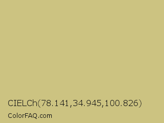 CIELCh 78.141,34.945,100.826 Color is a light yellow color and the nearest color is Straw #d4bf8d. Hex code #ccc381 and RGB value is rgb(204,195,129). In RGB color space, this color is composed of 80% red, 76% green, 51% blue, In CMYK color space, this color is composed of 0% cyan, 4% magenta, 37% yellow , 20% black , In HSL color space, this color has a hue angle of 53° , 42% saturation and 65% lightness.