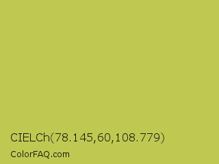 CIELCh 78.145,60,108.779 Color is a normal yellow color and the nearest color is Celery #b8c25d. Hex code #bfc952 and RGB value is rgb(191,201,82). In RGB color space, this color is composed of 75% red, 79% green, 32% blue, In CMYK color space, this color is composed of 5% cyan, 0% magenta, 59% yellow , 21% black , In HSL color space, this color has a hue angle of 65° , 52% saturation and 55% lightness.