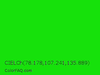 CIELCh 78.178,107.241,135.889 Color is a normal green color and the nearest color is Green #00ff00. Hex code #17e00a and RGB value is rgb(23,224,10). In RGB color space, this color is composed of 9% red, 88% green, 4% blue, In CMYK color space, this color is composed of 90% cyan, 0% magenta, 96% yellow , 12% black , In HSL color space, this color has a hue angle of 116° , 91% saturation and 46% lightness.