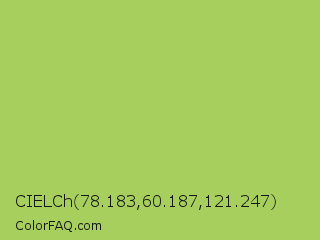 CIELCh 78.183,60.187,121.247 Color is a normal green color and the nearest color is Middle Green Yellow #acbf60. Hex code #a6cf5d and RGB value is rgb(166,207,93). In RGB color space, this color is composed of 65% red, 81% green, 36% blue, In CMYK color space, this color is composed of 20% cyan, 0% magenta, 55% yellow , 19% black , In HSL color space, this color has a hue angle of 82° , 54% saturation and 59% lightness.