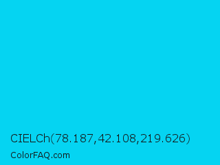 CIELCh 78.187,42.108,219.626 Color is a normal cyan color and the nearest color is Vivid Sky Blue #00ccff. Hex code #05d4f2 and RGB value is rgb(5,212,242). In RGB color space, this color is composed of 2% red, 83% green, 95% blue, In CMYK color space, this color is composed of 98% cyan, 12% magenta, 0% yellow , 5% black , In HSL color space, this color has a hue angle of 188° , 96% saturation and 48% lightness.
