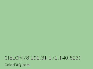 CIELCh 78.191,31.171,140.823 Color is a light green color and the nearest color is Eton Blue #96c8a2. Hex code #a0cd9c and RGB value is rgb(160,205,156). In RGB color space, this color is composed of 63% red, 80% green, 61% blue, In CMYK color space, this color is composed of 22% cyan, 0% magenta, 24% yellow , 20% black , In HSL color space, this color has a hue angle of 115° , 33% saturation and 71% lightness.