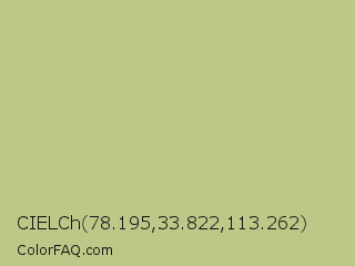 CIELCh 78.195,33.822,113.262 Color is a light yellow color and the nearest color is Pine Glade #c7cd90. Hex code #bec787 and RGB value is rgb(190,199,135). In RGB color space, this color is composed of 75% red, 78% green, 53% blue, In CMYK color space, this color is composed of 5% cyan, 0% magenta, 32% yellow , 22% black , In HSL color space, this color has a hue angle of 68° , 36% saturation and 65% lightness.