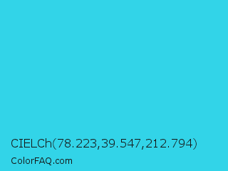 CIELCh 78.223,39.547,212.794 Color is a normal cyan color and the nearest color is Scooter #2ebfd4. Hex code #32d4e8 and RGB value is rgb(50,212,232). In RGB color space, this color is composed of 20% red, 83% green, 91% blue, In CMYK color space, this color is composed of 78% cyan, 9% magenta, 0% yellow , 9% black , In HSL color space, this color has a hue angle of 187° , 80% saturation and 55% lightness.