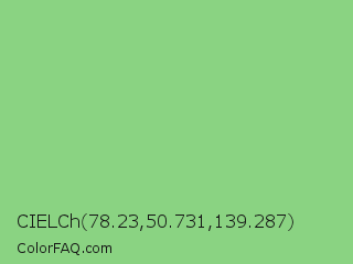 CIELCh 78.23,50.731,139.287 Color is a light green color and the nearest color is De York #7ac488. Hex code #8ad382 and RGB value is rgb(138,211,130). In RGB color space, this color is composed of 54% red, 83% green, 51% blue, In CMYK color space, this color is composed of 35% cyan, 0% magenta, 38% yellow , 17% black , In HSL color space, this color has a hue angle of 114° , 48% saturation and 67% lightness.