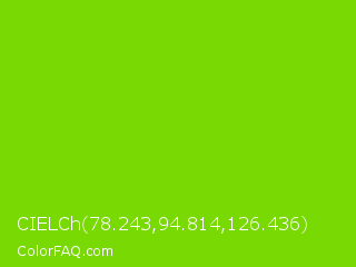 CIELCh 78.243,94.814,126.436 Color is a normal green color and the nearest color is Alien Armpit #84de02. Hex code #78d903 and RGB value is rgb(120,217,3). In RGB color space, this color is composed of 47% red, 85% green, 1% blue, In CMYK color space, this color is composed of 45% cyan, 0% magenta, 99% yellow , 15% black , In HSL color space, this color has a hue angle of 87° , 97% saturation and 43% lightness.