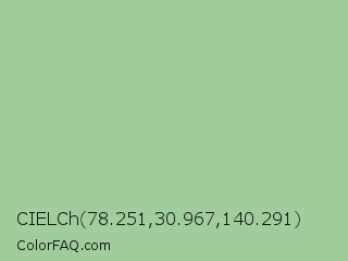 CIELCh 78.251,30.967,140.291 Color is a light green color and the nearest color is Eton Blue #96c8a2. Hex code #a1cd9c and RGB value is rgb(161,205,156). In RGB color space, this color is composed of 63% red, 80% green, 61% blue, In CMYK color space, this color is composed of 21% cyan, 0% magenta, 24% yellow , 20% black , In HSL color space, this color has a hue angle of 114° , 33% saturation and 71% lightness.