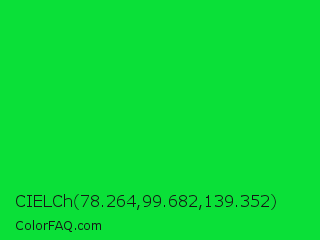 CIELCh 78.264,99.682,139.352 Color is a normal green color and the nearest color is Vivid Malachite #00cc33. Hex code #0ae038 and RGB value is rgb(10,224,56). In RGB color space, this color is composed of 4% red, 88% green, 22% blue, In CMYK color space, this color is composed of 96% cyan, 0% magenta, 75% yellow , 12% black , In HSL color space, this color has a hue angle of 133° , 91% saturation and 46% lightness.