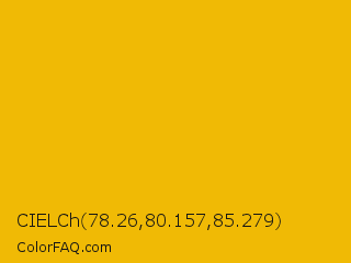 CIELCh 78.26,80.157,85.279 Color is a normal yellow color and the nearest color is Corn #e7bf05. Hex code #f0ba05 and RGB value is rgb(240,186,5). In RGB color space, this color is composed of 94% red, 73% green, 2% blue, In CMYK color space, this color is composed of 0% cyan, 23% magenta, 98% yellow , 6% black , In HSL color space, this color has a hue angle of 46° , 96% saturation and 48% lightness.