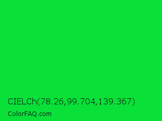 CIELCh 78.26,99.704,139.367 Color is a normal green color and the nearest color is Vivid Malachite #00cc33. Hex code #09e038 and RGB value is rgb(9,224,56). In RGB color space, this color is composed of 4% red, 88% green, 22% blue, In CMYK color space, this color is composed of 96% cyan, 0% magenta, 75% yellow , 12% black , In HSL color space, this color has a hue angle of 133° , 92% saturation and 46% lightness.