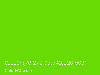 CIELCh 78.272,97.743,128.998 Color is a normal green color and the nearest color is Alien Armpit #84de02. Hex code #69db04 and RGB value is rgb(105,219,4). In RGB color space, this color is composed of 41% red, 86% green, 2% blue, In CMYK color space, this color is composed of 52% cyan, 0% magenta, 98% yellow , 14% black , In HSL color space, this color has a hue angle of 92° , 96% saturation and 44% lightness.