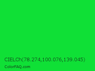 CIELCh 78.274,100.076,139.045 Color is a normal green color and the nearest color is Vivid Malachite #00cc33. Hex code #0fe036 and RGB value is rgb(15,224,54). In RGB color space, this color is composed of 6% red, 88% green, 21% blue, In CMYK color space, this color is composed of 93% cyan, 0% magenta, 76% yellow , 12% black , In HSL color space, this color has a hue angle of 131° , 87% saturation and 47% lightness.