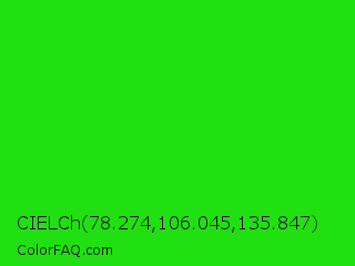 CIELCh 78.274,106.045,135.847 Color is a normal green color and the nearest color is Neon Green #39ff14. Hex code #21e012 and RGB value is rgb(33,224,18). In RGB color space, this color is composed of 13% red, 88% green, 7% blue, In CMYK color space, this color is composed of 85% cyan, 0% magenta, 92% yellow , 12% black , In HSL color space, this color has a hue angle of 116° , 85% saturation and 47% lightness.