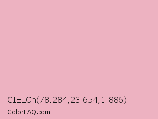 CIELCh 78.284,23.654,1.886 Color is a very light red color and the nearest color is Nadeshiko Pink #f6adc6. Hex code #edb2c1 and RGB value is rgb(237,178,193). In RGB color space, this color is composed of 93% red, 70% green, 76% blue, In CMYK color space, this color is composed of 0% cyan, 25% magenta, 19% yellow , 7% black , In HSL color space, this color has a hue angle of 345° , 62% saturation and 81% lightness.