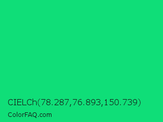 CIELCh 78.287,76.893,150.739 Color is a normal green color and the nearest color is Spring Green #00ff7f. Hex code #0fde78 and RGB value is rgb(15,222,120). In RGB color space, this color is composed of 6% red, 87% green, 47% blue, In CMYK color space, this color is composed of 93% cyan, 0% magenta, 46% yellow , 13% black , In HSL color space, this color has a hue angle of 150° , 87% saturation and 46% lightness.