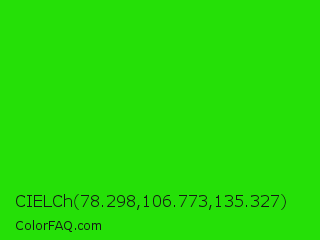 CIELCh 78.298,106.773,135.327 Color is a normal green color and the nearest color is Neon Green #39ff14. Hex code #25e007 and RGB value is rgb(37,224,7). In RGB color space, this color is composed of 15% red, 88% green, 3% blue, In CMYK color space, this color is composed of 83% cyan, 0% magenta, 97% yellow , 12% black , In HSL color space, this color has a hue angle of 112° , 94% saturation and 45% lightness.