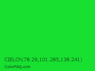 CIELCh 78.29,101.285,138.241 Color is a normal green color and the nearest color is Vivid Malachite #00cc33. Hex code #17e030 and RGB value is rgb(23,224,48). In RGB color space, this color is composed of 9% red, 88% green, 19% blue, In CMYK color space, this color is composed of 90% cyan, 0% magenta, 79% yellow , 12% black , In HSL color space, this color has a hue angle of 127° , 81% saturation and 48% lightness.