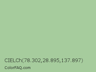 CIELCh 78.302,28.895,137.897 Color is a light green color and the nearest color is Norway #a8bd9f. Hex code #a6cc9d and RGB value is rgb(166,204,157). In RGB color space, this color is composed of 65% red, 80% green, 62% blue, In CMYK color space, this color is composed of 19% cyan, 0% magenta, 23% yellow , 20% black , In HSL color space, this color has a hue angle of 109° , 32% saturation and 71% lightness.