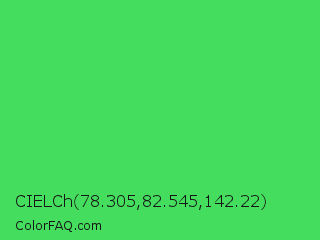 CIELCh 78.305,82.545,142.22 Color is a normal green color and the nearest color is UFO Green #3cd070. Hex code #44dd5d and RGB value is rgb(68,221,93). In RGB color space, this color is composed of 27% red, 87% green, 36% blue, In CMYK color space, this color is composed of 69% cyan, 0% magenta, 58% yellow , 13% black , In HSL color space, this color has a hue angle of 130° , 69% saturation and 57% lightness.