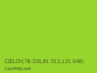 CIELCh 78.326,81.512,121.648 Color is a normal green color and the nearest color is Atlantis #97cd2d. Hex code #96d42e and RGB value is rgb(150,212,46). In RGB color space, this color is composed of 59% red, 83% green, 18% blue, In CMYK color space, this color is composed of 29% cyan, 0% magenta, 78% yellow , 17% black , In HSL color space, this color has a hue angle of 82° , 66% saturation and 51% lightness.
