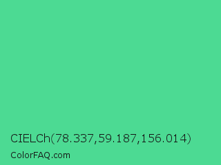 CIELCh 78.337,59.187,156.014 Color is a normal green color and the nearest color is Eucalyptus #44d7a8. Hex code #4cda93 and RGB value is rgb(76,218,147). In RGB color space, this color is composed of 30% red, 85% green, 58% blue, In CMYK color space, this color is composed of 65% cyan, 0% magenta, 33% yellow , 15% black , In HSL color space, this color has a hue angle of 150° , 66% saturation and 58% lightness.