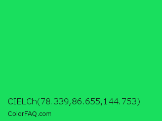CIELCh 78.339,86.655,144.753 Color is a normal green color and the nearest color is Malachite #0bda51. Hex code #19df5e and RGB value is rgb(25,223,94). In RGB color space, this color is composed of 10% red, 87% green, 37% blue, In CMYK color space, this color is composed of 89% cyan, 0% magenta, 58% yellow , 13% black , In HSL color space, this color has a hue angle of 141° , 80% saturation and 49% lightness.
