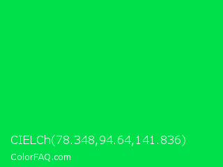 CIELCh 78.348,94.64,141.836 Color is a normal green color and the nearest color is Malachite #0bda51. Hex code #00e04a and RGB value is rgb(0,224,74). In RGB color space, this color is composed of 0% red, 88% green, 29% blue, In CMYK color space, this color is composed of 100% cyan, 0% magenta, 67% yellow , 12% black , In HSL color space, this color has a hue angle of 140° , 100% saturation and 44% lightness.