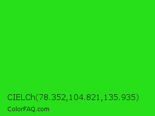CIELCh 78.352,104.821,135.935 Color is a normal green color and the nearest color is Lime Green #32cd32. Hex code #27e019 and RGB value is rgb(39,224,25). In RGB color space, this color is composed of 15% red, 88% green, 10% blue, In CMYK color space, this color is composed of 83% cyan, 0% magenta, 89% yellow , 12% black , In HSL color space, this color has a hue angle of 116° , 80% saturation and 49% lightness.