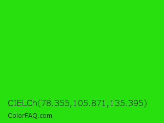 CIELCh 78.355,105.871,135.395 Color is a normal green color and the nearest color is Neon Green #39ff14. Hex code #29e00f and RGB value is rgb(41,224,15). In RGB color space, this color is composed of 16% red, 88% green, 6% blue, In CMYK color space, this color is composed of 82% cyan, 0% magenta, 93% yellow , 12% black , In HSL color space, this color has a hue angle of 113° , 87% saturation and 47% lightness.