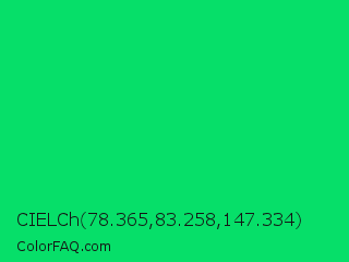 CIELCh 78.365,83.258,147.334 Color is a normal green color and the nearest color is Malachite #0bda51. Hex code #06df69 and RGB value is rgb(6,223,105). In RGB color space, this color is composed of 2% red, 87% green, 41% blue, In CMYK color space, this color is composed of 97% cyan, 0% magenta, 53% yellow , 13% black , In HSL color space, this color has a hue angle of 147° , 95% saturation and 45% lightness.