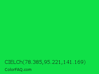 CIELCh 78.385,95.221,141.169 Color is a normal green color and the nearest color is Malachite #0bda51. Hex code #0fe047 and RGB value is rgb(15,224,71). In RGB color space, this color is composed of 6% red, 88% green, 28% blue, In CMYK color space, this color is composed of 93% cyan, 0% magenta, 68% yellow , 12% black , In HSL color space, this color has a hue angle of 136° , 87% saturation and 47% lightness.