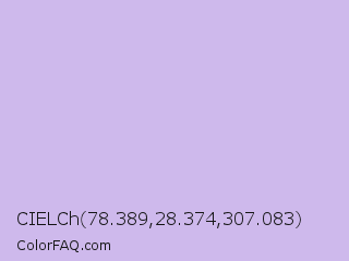 CIELCh 78.389,28.374,307.083 Color is a very light violet color and the nearest color is Prelude #d0c0e5. Hex code #ceb9ec and RGB value is rgb(206,185,236). In RGB color space, this color is composed of 81% red, 73% green, 93% blue, In CMYK color space, this color is composed of 13% cyan, 22% magenta, 0% yellow , 7% black , In HSL color space, this color has a hue angle of 265° , 57% saturation and 83% lightness.