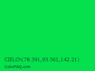 CIELCh 78.391,93.561,142.21 Color is a normal green color and the nearest color is Malachite #0bda51. Hex code #05e04d and RGB value is rgb(5,224,77). In RGB color space, this color is composed of 2% red, 88% green, 30% blue, In CMYK color space, this color is composed of 98% cyan, 0% magenta, 66% yellow , 12% black , In HSL color space, this color has a hue angle of 140° , 96% saturation and 45% lightness.