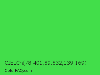 CIELCh 78.401,89.832,139.169 Color is a normal green color and the nearest color is Lime Green #32cd32. Hex code #42de4a and RGB value is rgb(66,222,74). In RGB color space, this color is composed of 26% red, 87% green, 29% blue, In CMYK color space, this color is composed of 70% cyan, 0% magenta, 67% yellow , 13% black , In HSL color space, this color has a hue angle of 123° , 70% saturation and 56% lightness.