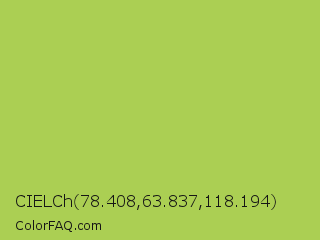 CIELCh 78.408,63.837,118.194 Color is a normal lime color and the nearest color is Conifer #acdd4d. Hex code #abcf53 and RGB value is rgb(171,207,83). In RGB color space, this color is composed of 67% red, 81% green, 33% blue, In CMYK color space, this color is composed of 17% cyan, 0% magenta, 60% yellow , 19% black , In HSL color space, this color has a hue angle of 77° , 56% saturation and 57% lightness.