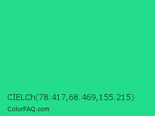 CIELCh 78.417,68.469,155.215 Color is a normal green color and the nearest color is Shamrock #33cc99. Hex code #24dd8a and RGB value is rgb(36,221,138). In RGB color space, this color is composed of 14% red, 87% green, 54% blue, In CMYK color space, this color is composed of 84% cyan, 0% magenta, 38% yellow , 13% black , In HSL color space, this color has a hue angle of 153° , 73% saturation and 50% lightness.