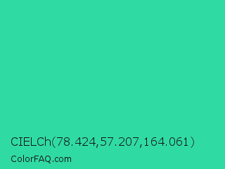 CIELCh 78.424,57.207,164.061 Color is a normal green color and the nearest color is Shamrock #33cc99. Hex code #30dba3 and RGB value is rgb(48,219,163). In RGB color space, this color is composed of 19% red, 86% green, 64% blue, In CMYK color space, this color is composed of 78% cyan, 0% magenta, 26% yellow , 14% black , In HSL color space, this color has a hue angle of 160° , 70% saturation and 52% lightness.