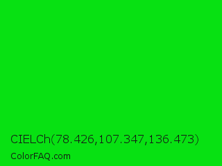 CIELCh 78.426,107.347,136.473 Color is a normal green color and the nearest color is Green #00ff00. Hex code #07e112 and RGB value is rgb(7,225,18). In RGB color space, this color is composed of 3% red, 88% green, 7% blue, In CMYK color space, this color is composed of 97% cyan, 0% magenta, 92% yellow , 12% black , In HSL color space, this color has a hue angle of 123° , 94% saturation and 45% lightness.
