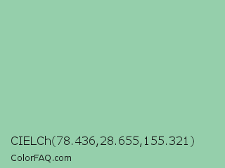 CIELCh 78.436,28.655,155.321 Color is a light green color and the nearest color is Eton Blue #96c8a2. Hex code #95cfab and RGB value is rgb(149,207,171). In RGB color space, this color is composed of 58% red, 81% green, 67% blue, In CMYK color space, this color is composed of 28% cyan, 0% magenta, 17% yellow , 19% black , In HSL color space, this color has a hue angle of 143° , 38% saturation and 70% lightness.