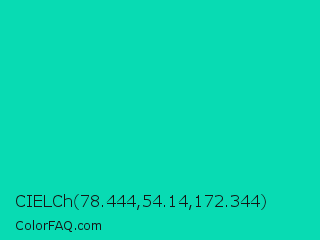 CIELCh 78.444,54.14,172.344 Color is a normal cyan color and the nearest color is Amazonite #00c4b0. Hex code #08dbb3 and RGB value is rgb(8,219,179). In RGB color space, this color is composed of 3% red, 86% green, 70% blue, In CMYK color space, this color is composed of 96% cyan, 0% magenta, 18% yellow , 14% black , In HSL color space, this color has a hue angle of 169° , 93% saturation and 45% lightness.